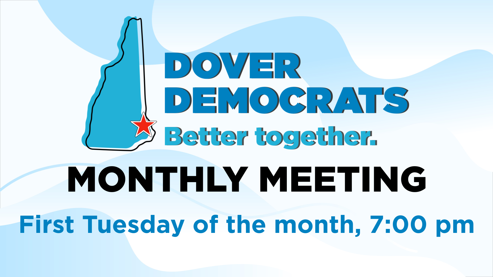 Join the Dover Dems for our monthly meeting where we discuss organizational priorities like supporting Democratic candidates, providing education and information, and building community!